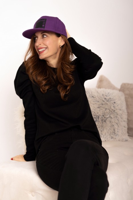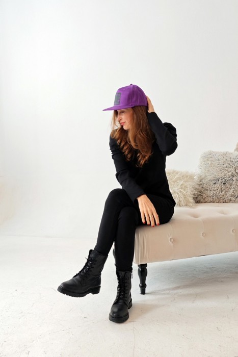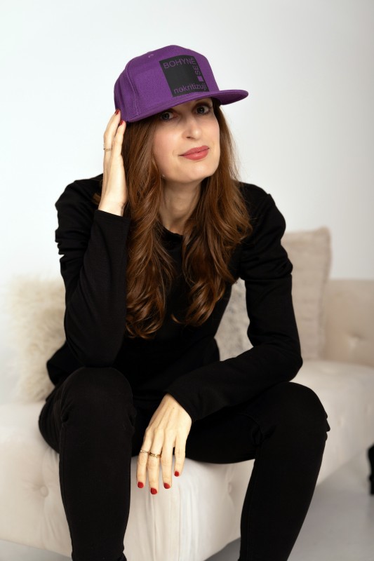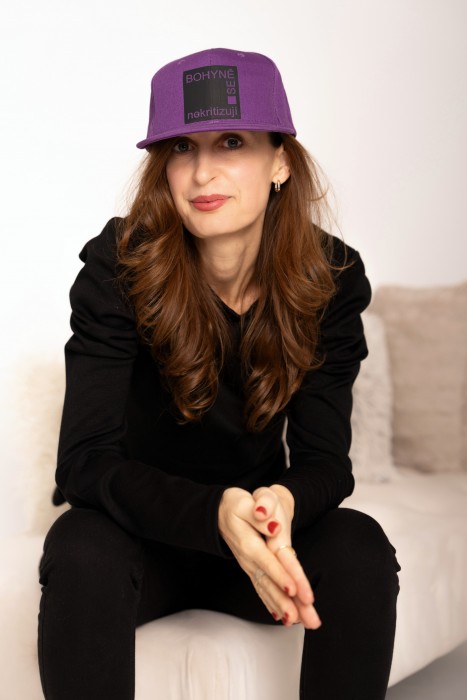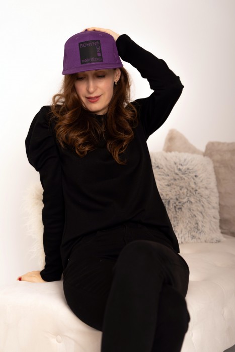 Fialová kšiltovka s výrazným autorským motivem Bohyně se nekritizují a rovným kšiltem. Minimalistický design s typografií, která nese jasné poselství.