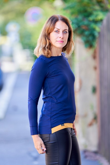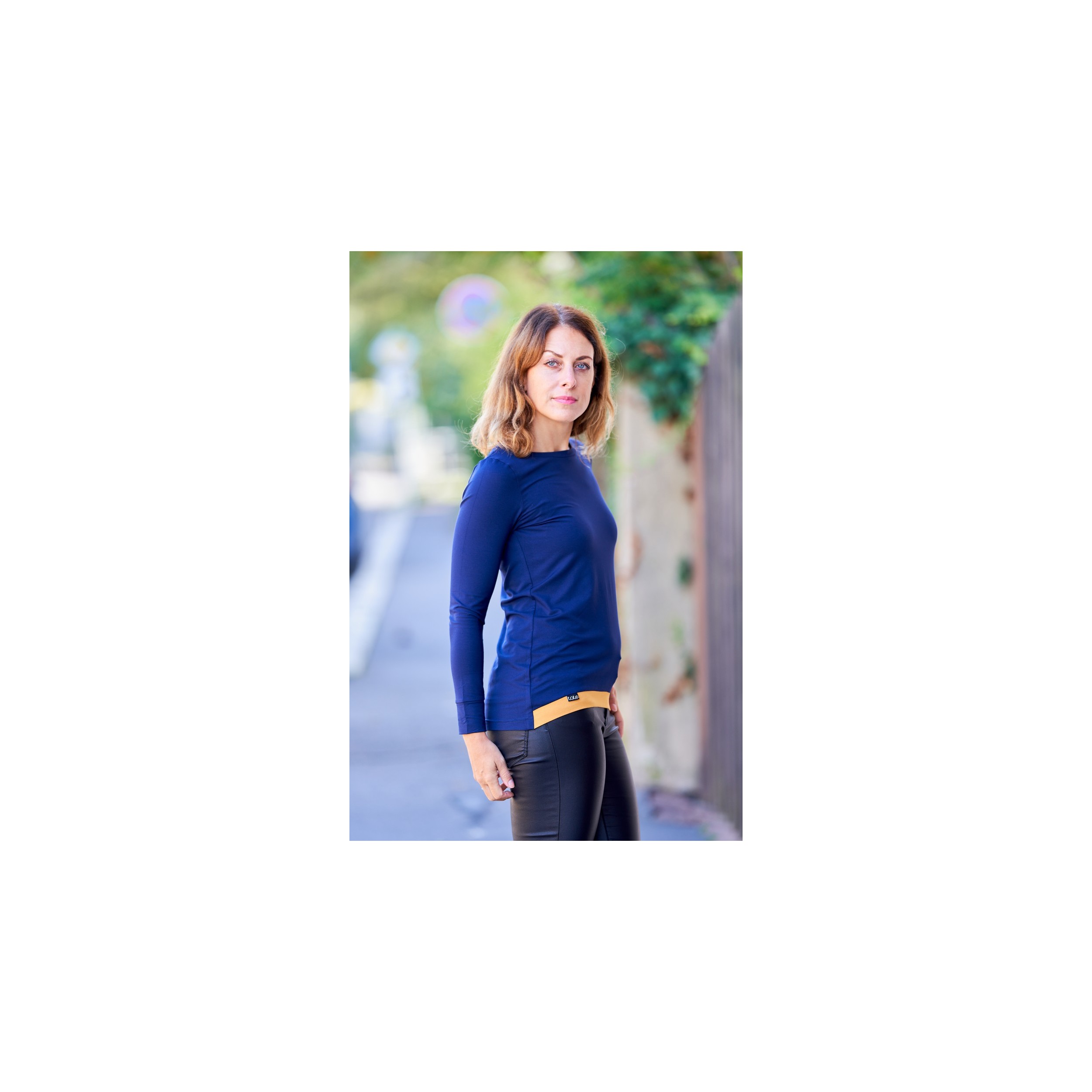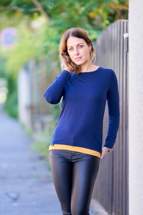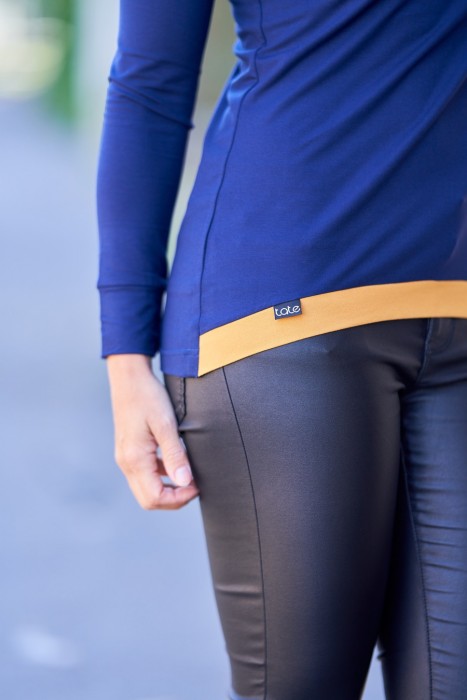Tmavě modré pružné triko. Na předním díle žlutý spodní lem. (viskóza/elasten).