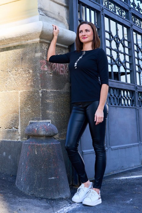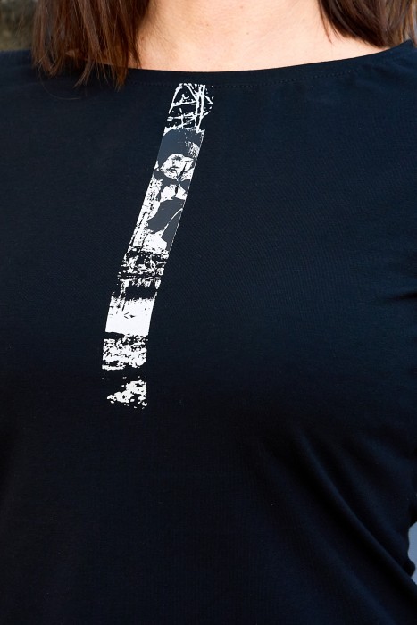 Objevte dokonalou kombinaci stylu a pohodlí s naším černým bavlněným trikem. Vypasovaný střih zvýrazní vaši postavu, zatímco 3/4 rukávy a lodičkový výstřih dodají elegantní nádech. Autorský potisk přidává originální prvek, který osvěží každý váš outfit. Ideální pro volný čas i speciální příležitosti! Materiál je měkký a příjemný na nošení, což zaručuje komfort po celý den.