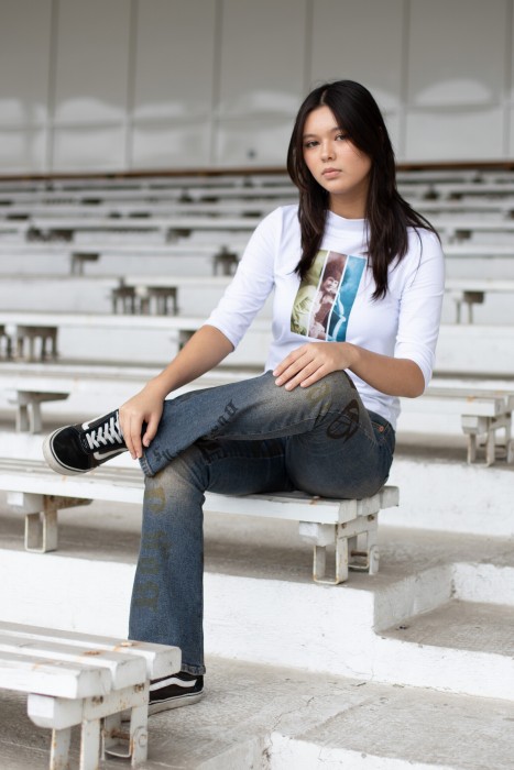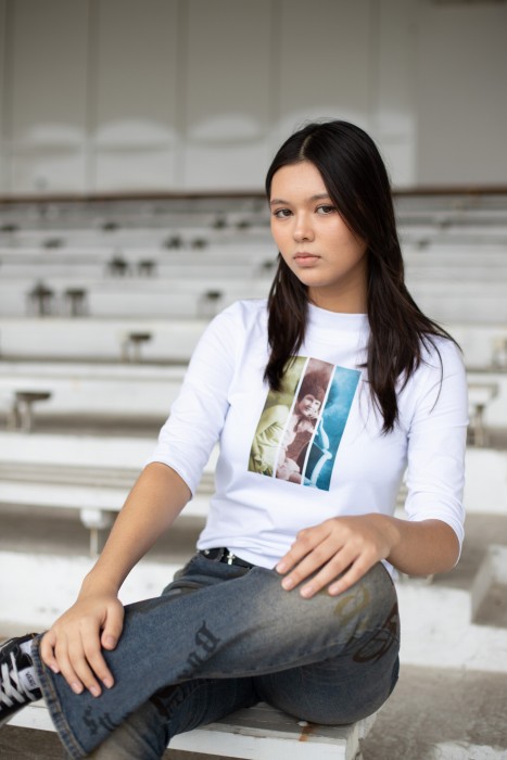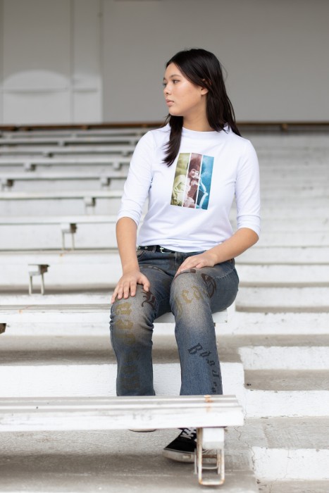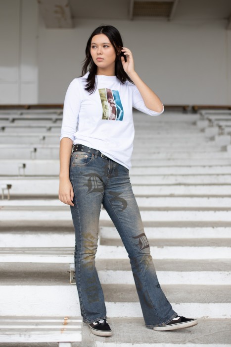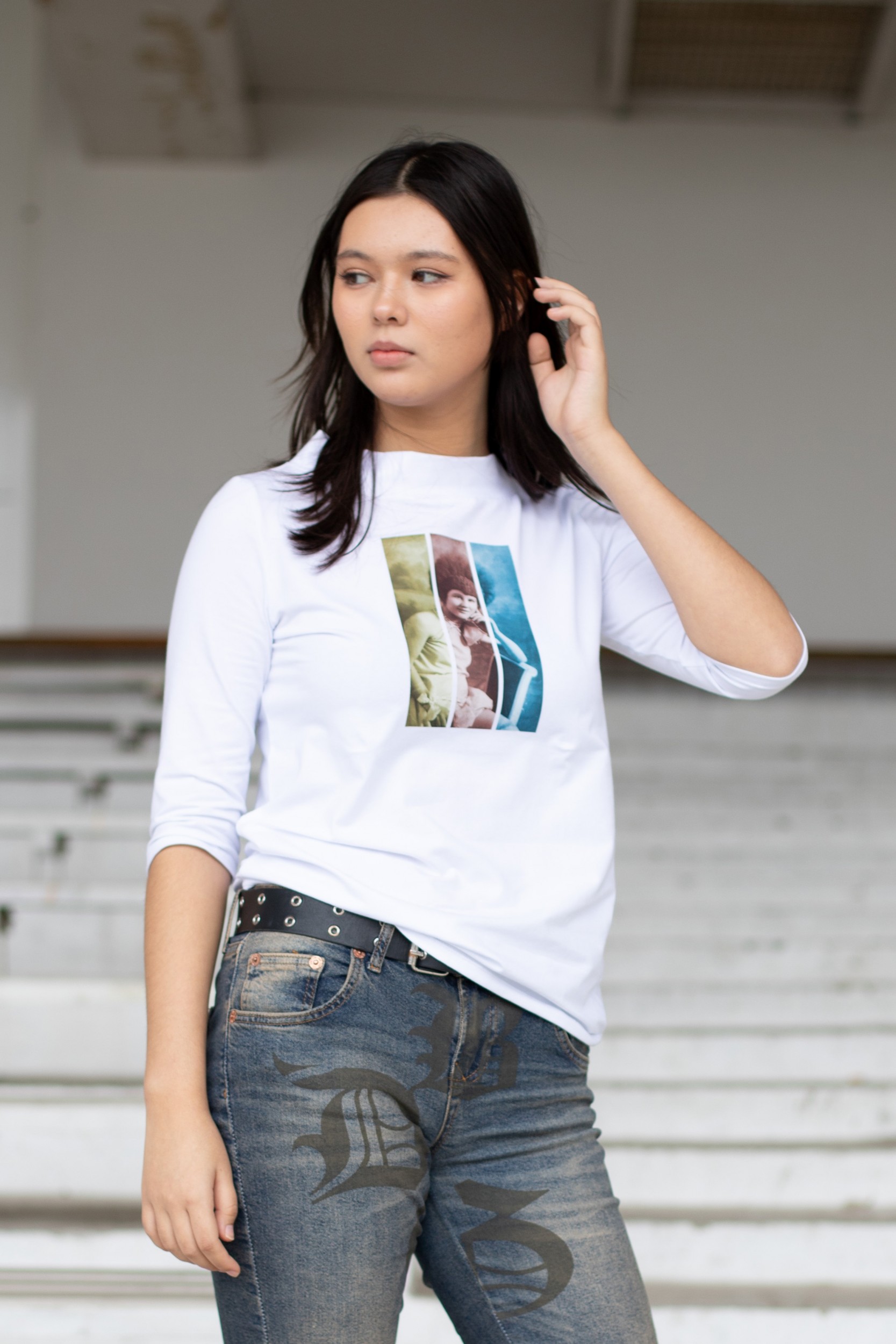Naše bílé bavlněné triko s elastanem nabízí styl a pohodlí v jednom. S volnějším střihem a elegantním stojáčkem se skvěle nosí, a třičtvrteční rukáv dodává šmrnc. Autorský tisk, inspirovaný prohlížením více než 100 let starými pohlednicemi z kabaretní revue, přináší unikátní vintage nádech. Ideální pro ty, kteří chtějí oživit svůj šatník originálním kouskem!