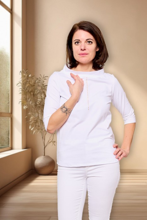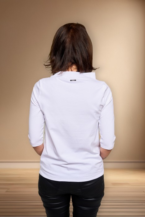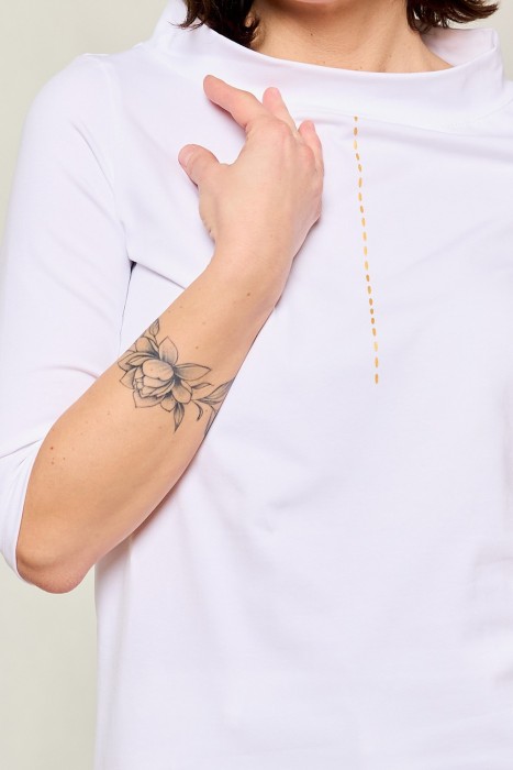 Bílé triko s 3/4 rukávem, vyrobené z kvalitní bavlny a elastanu, spojuje pohodlí a eleganci. Minimalistický potisk zlaté linky a stojáček na krku mu dodávají elegantní vzhled, který je ideální nejen na každodenní nošení, ale i na slavnostní příležitosti. Pružný materiál zajišťuje maximální komfort, takže se budete cítit skvěle po celý den.
