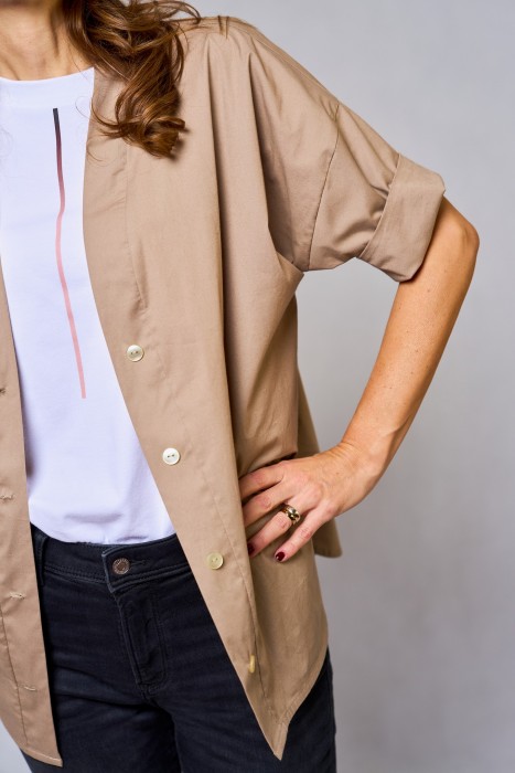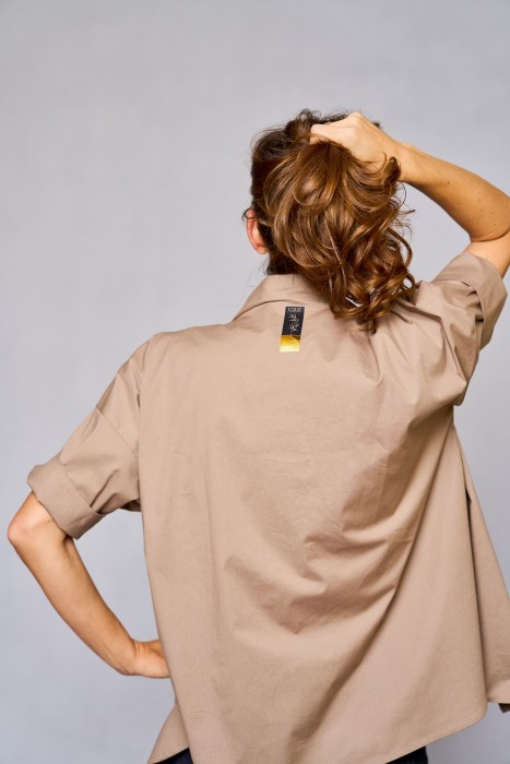 Stylová dámská košile v módní béžové barvě z příjemného bavlněného popelínu. Volný oversize střih, krátké rukávy, praktické kapsy a zapínání na knoflíky. Lehká, vzdušná a ideální pro každodenní nošení.