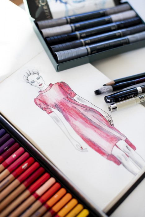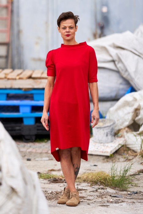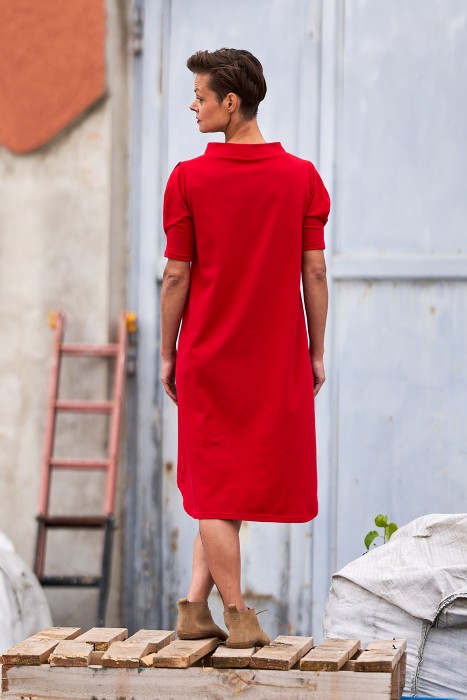 Červené bavlněné šaty se skládanými rukávy. Jako dárek k nim dostanete černý pásek.