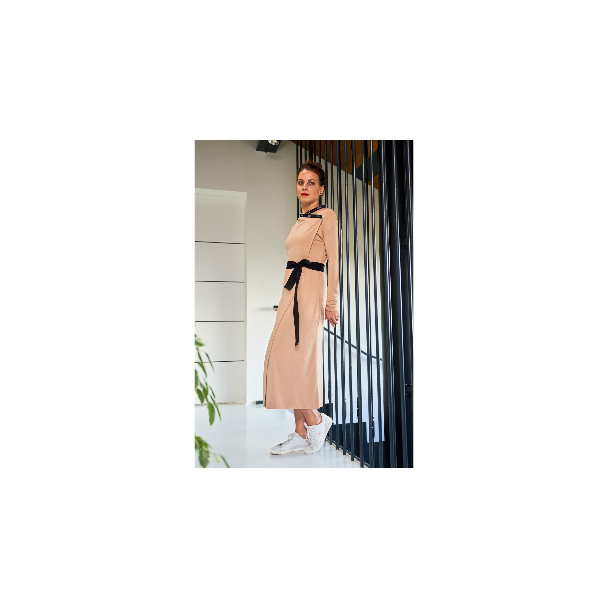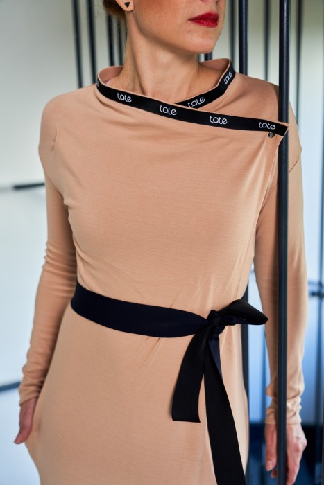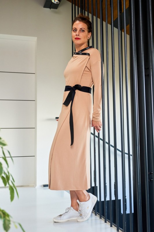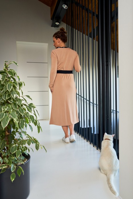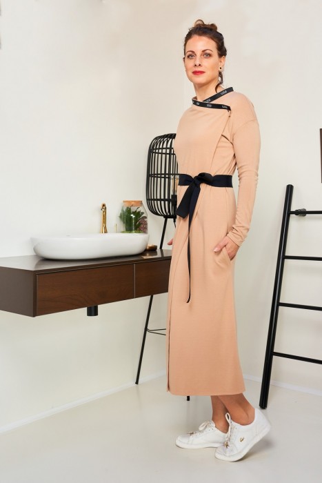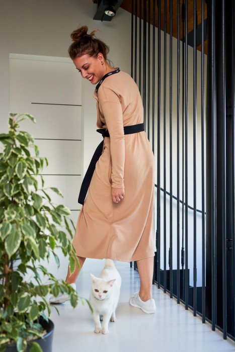 Teplejší zavinovací šaty, které se dají nosit i jako kardigan. Zapínají se na dvě patentky, mají kapsy a pásek.