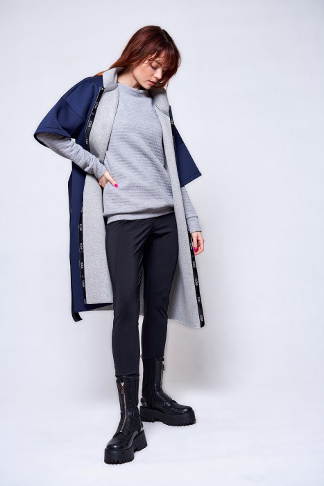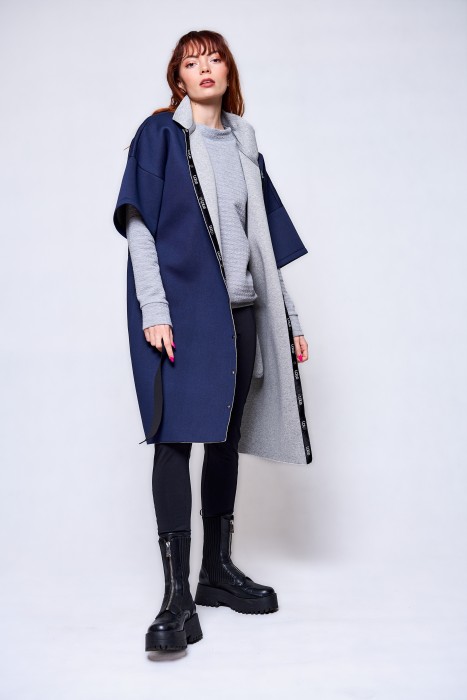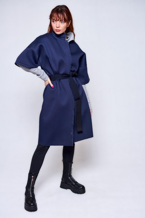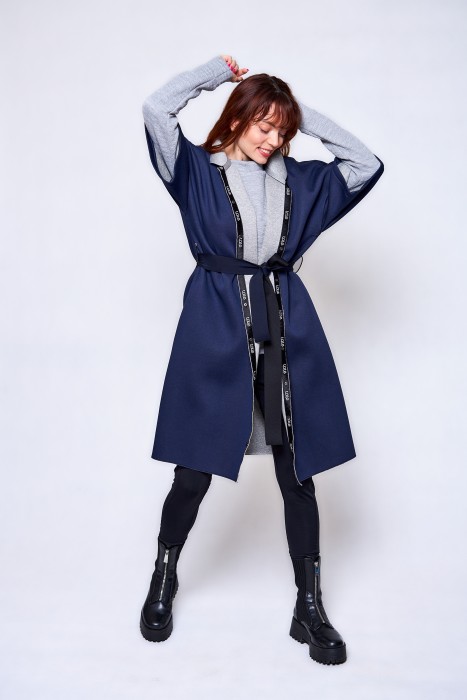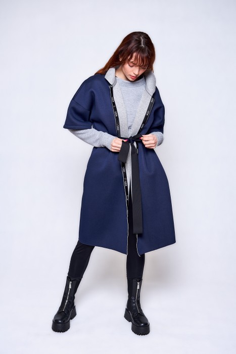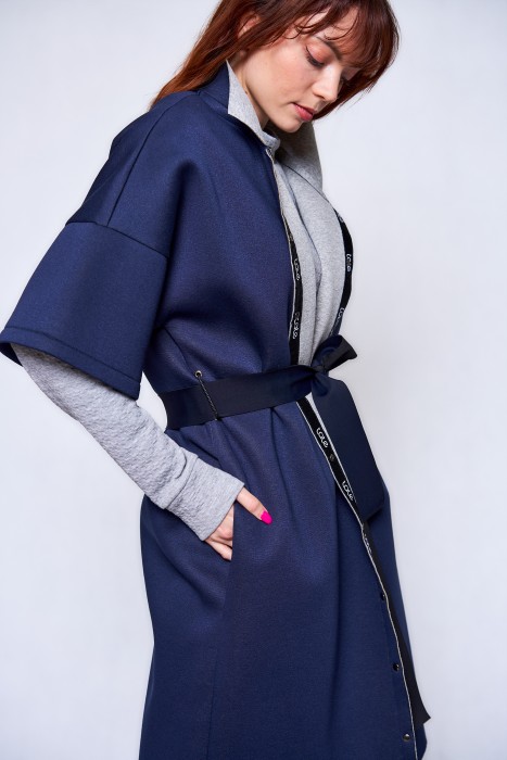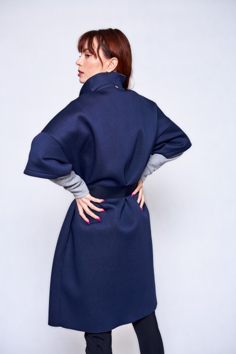 Tmavě modré kimono z oděvního neoprénu. Zapínání na patentky. Je hodně volné a stáhne se páskem. Pokud ho nechcete tolik nařasené vyberte o číslo menší.