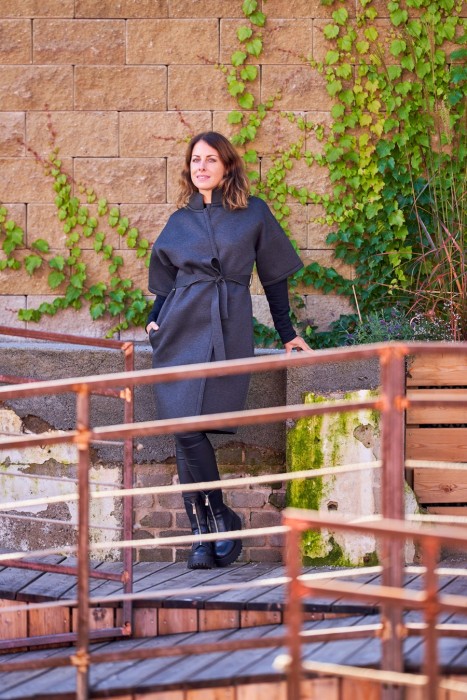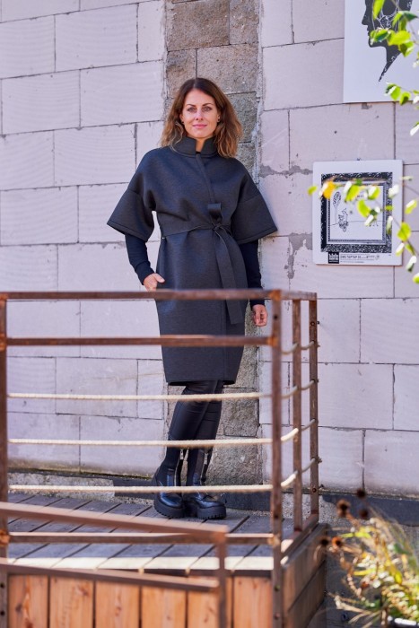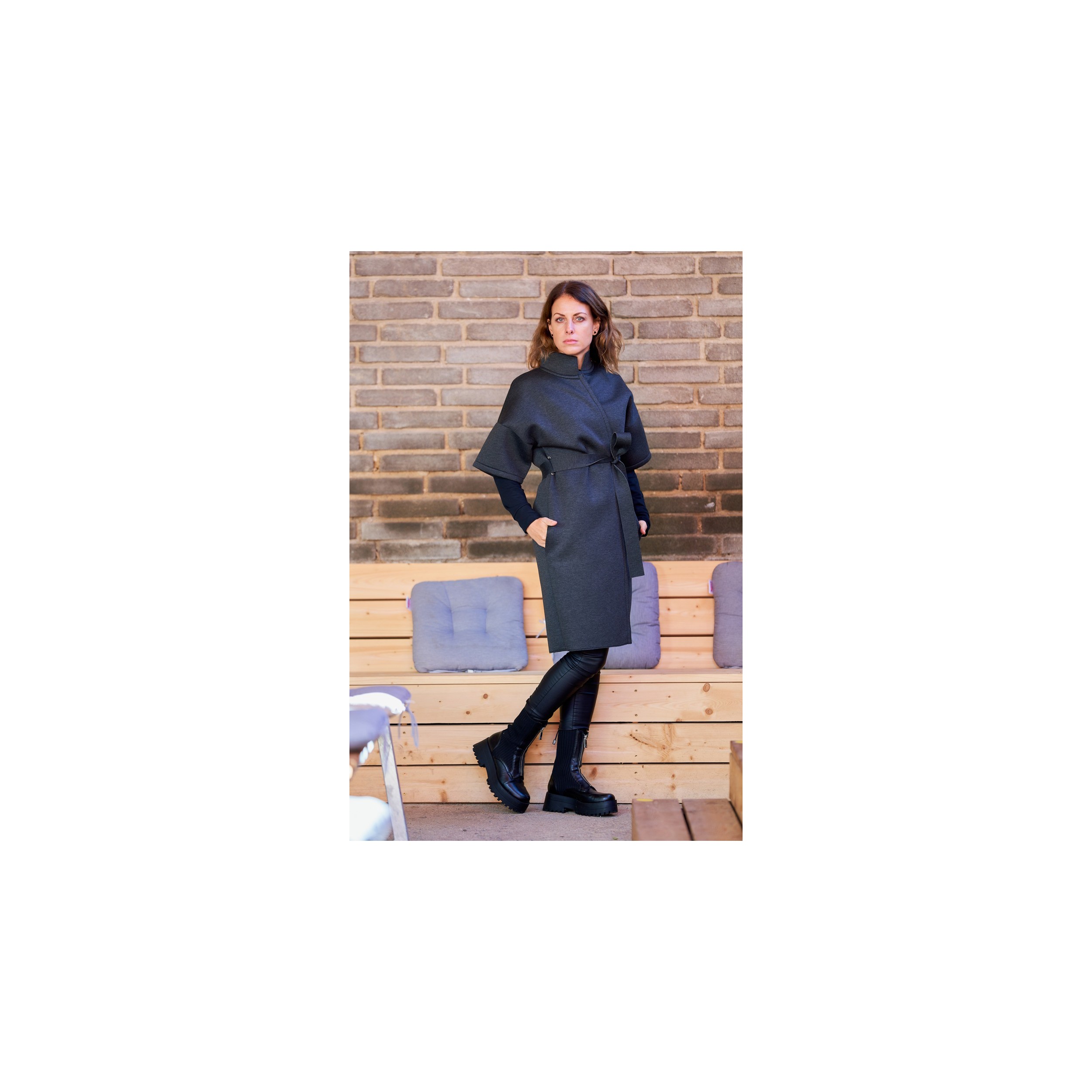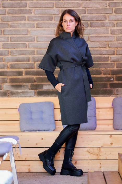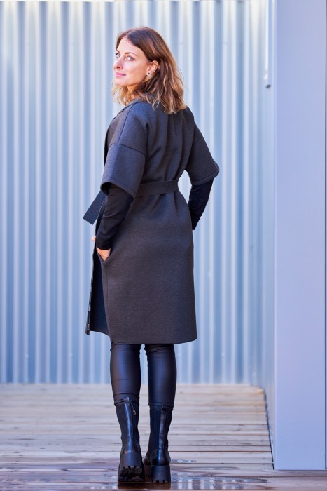 Šedé kimono z oděvního neoprénu. Je hodně volné a stáhne se páskem. Pokud ho nechcete tolik nařasené vyberte o číslo me