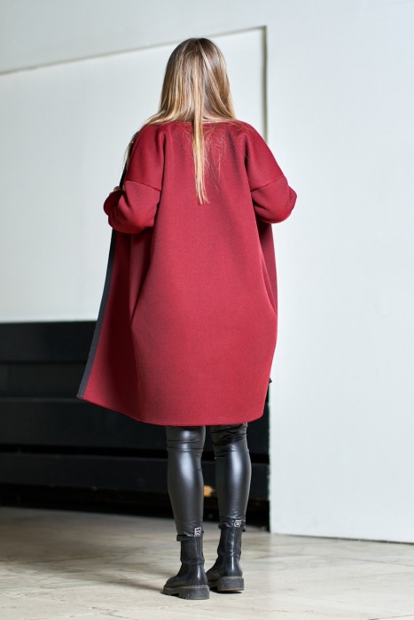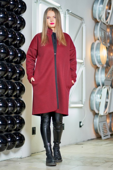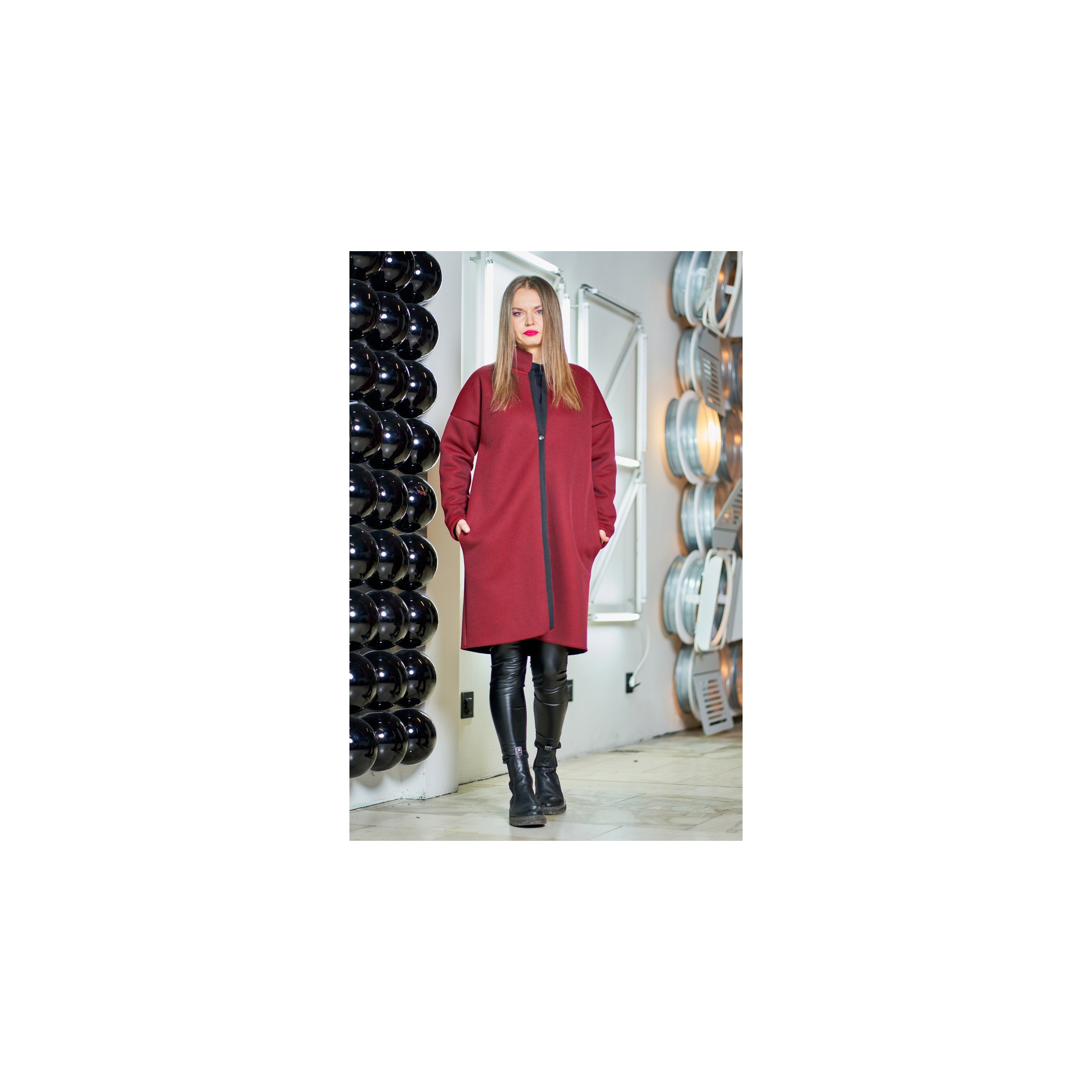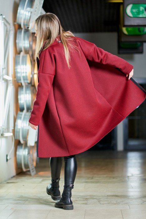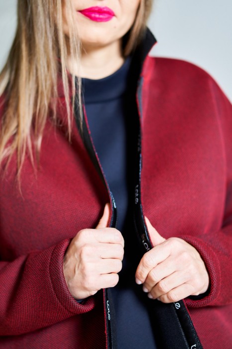 Červený flaušový kabát jehož vrchní strana je tkaná a vnitřní černá s jemným chloupkem. Zapínání na 6 patentů. (na fotografii je vidět jen jeden)