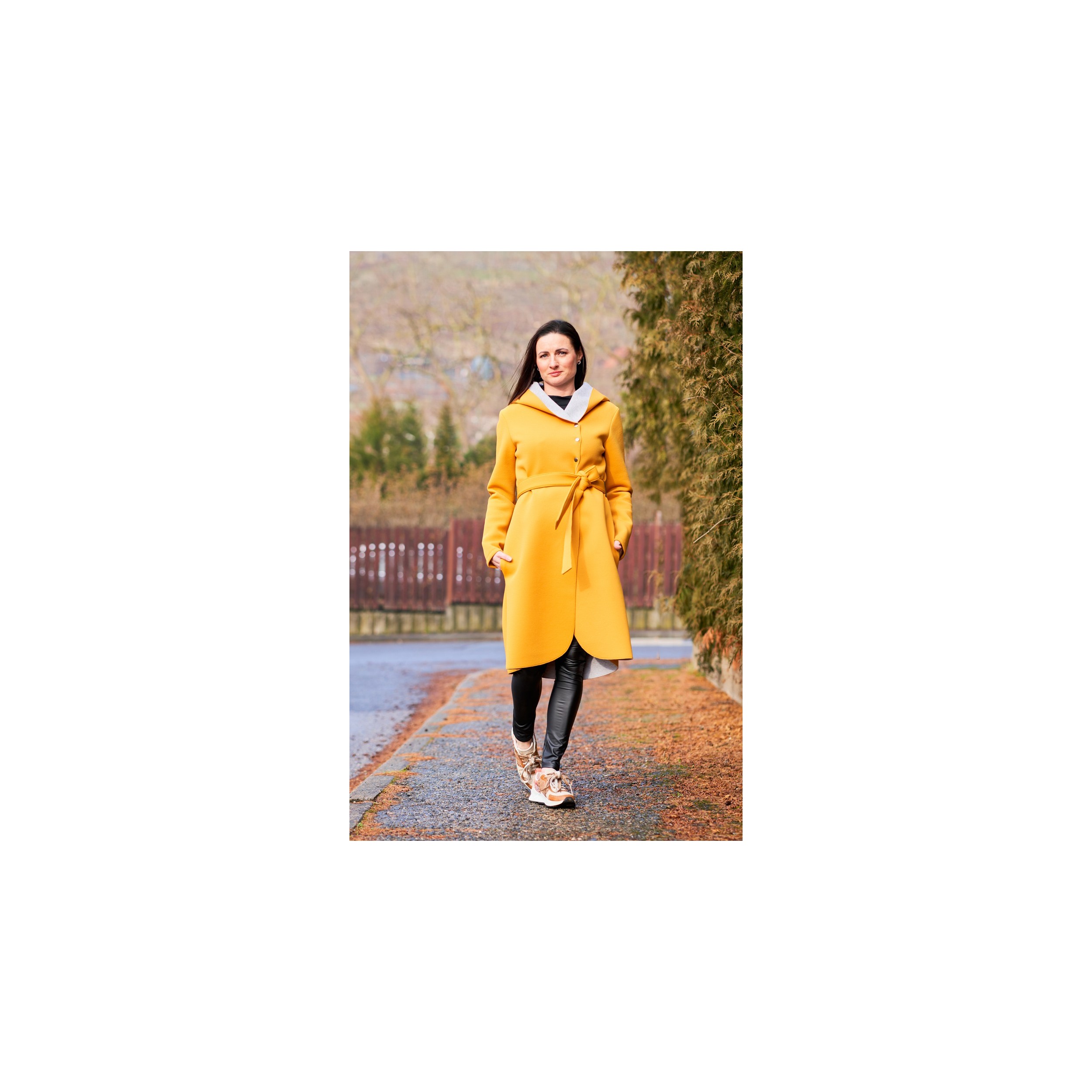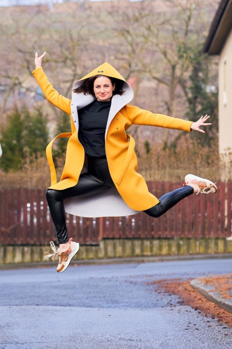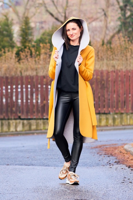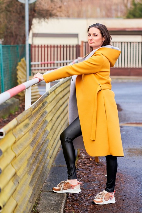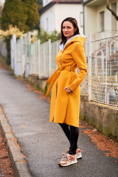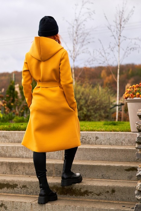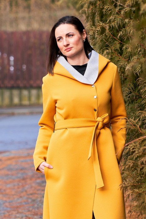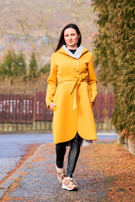 Hořčicově žlutý kabát z oděvního neoprénu. Je mírně pružný. Do +8´C zahřeje a neprofoukne. Má kapsy a pásek.