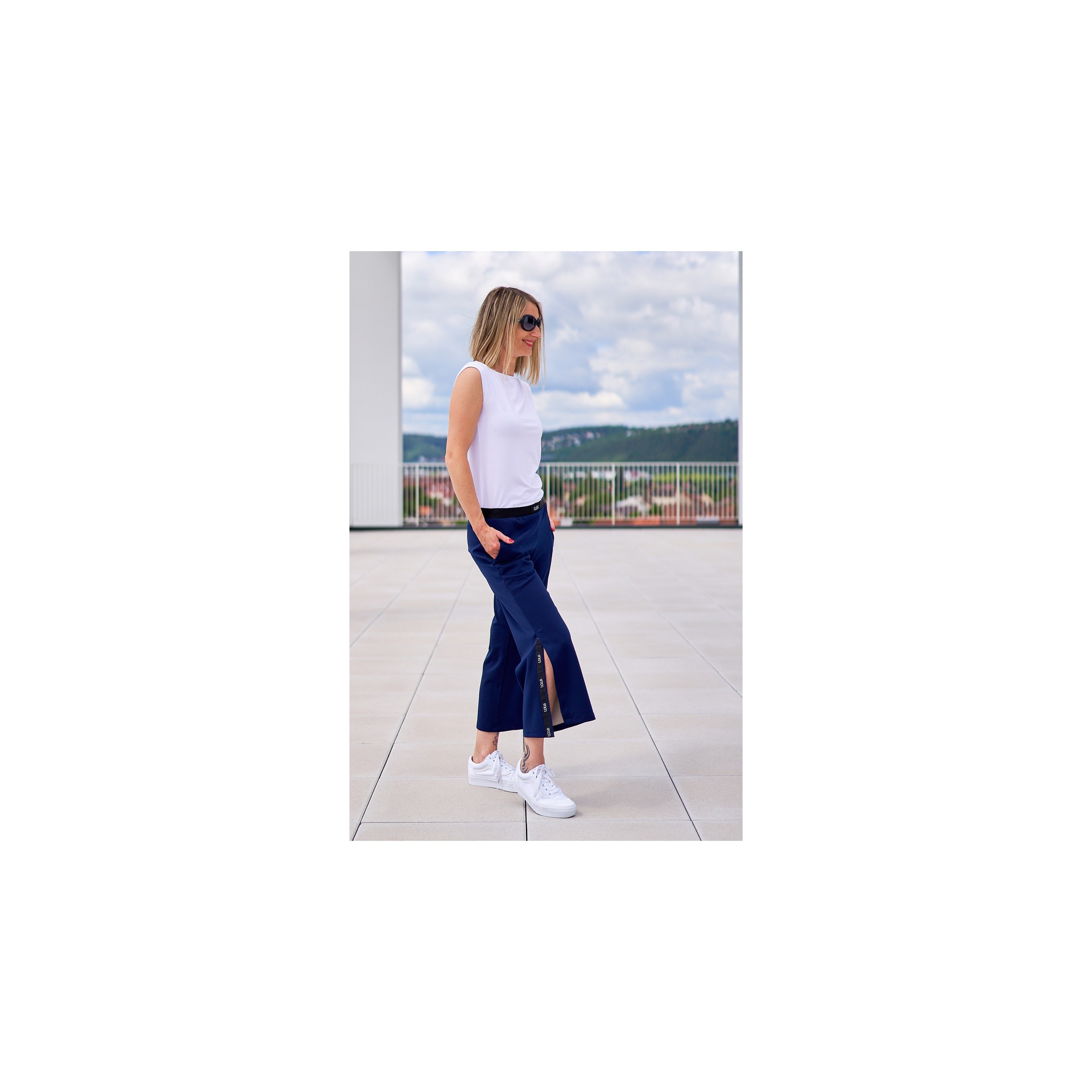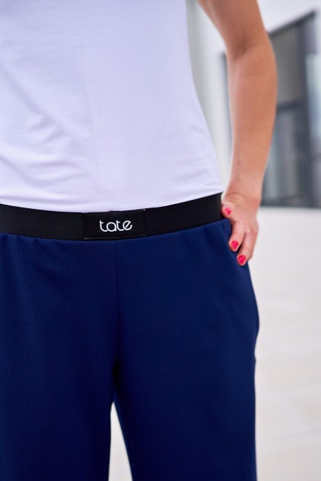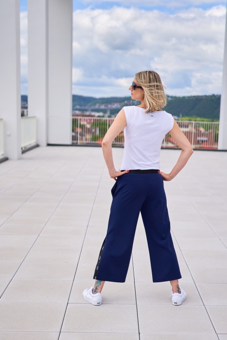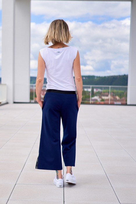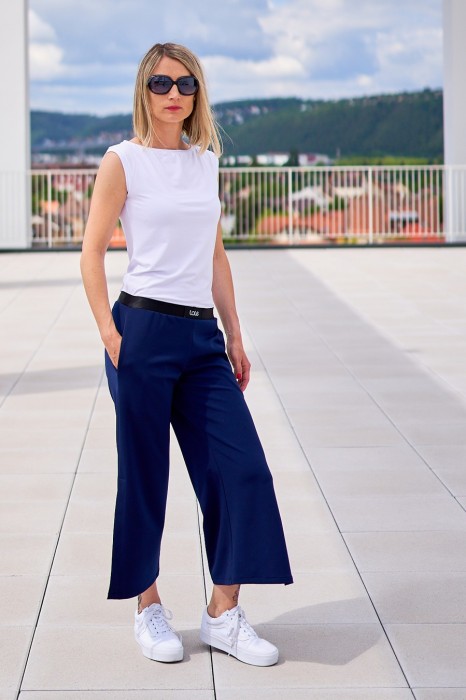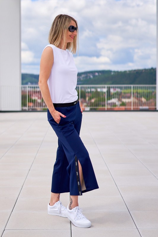 Modré kalhoty v pase na gumu, s kapsami a postraním rozparkem.