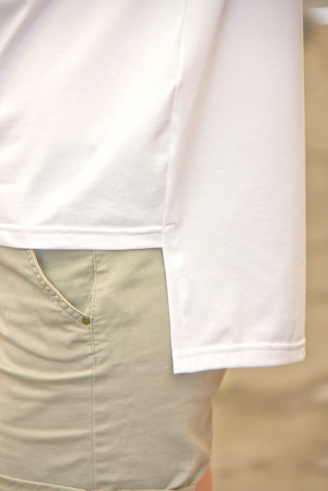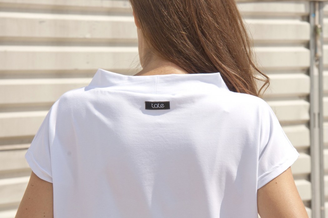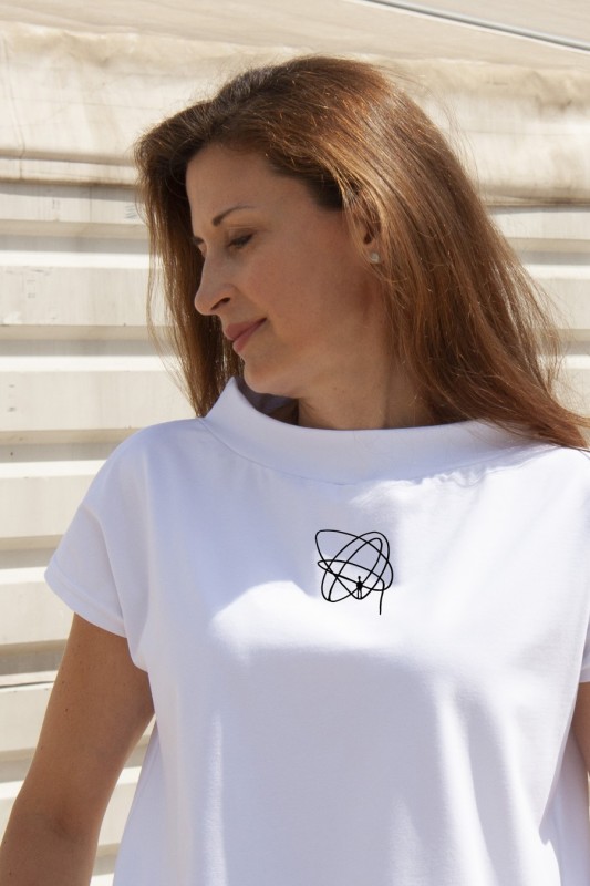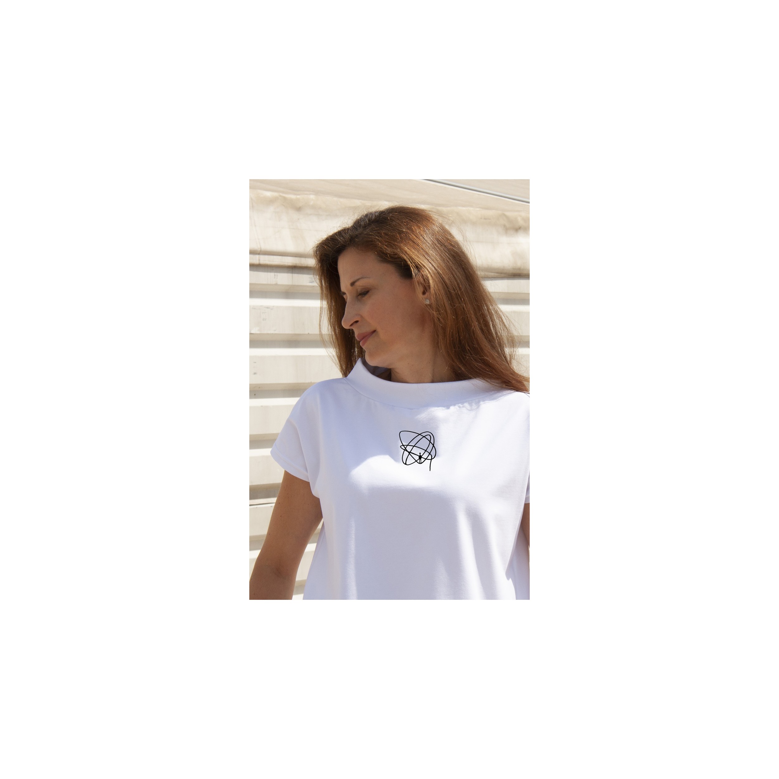 Bílá volnější triko z jemné bavlny se stojáčkem. Přední díl je kratší a vypadá dobře ho zahnout do šortek/kalhot. Autorský tisk.