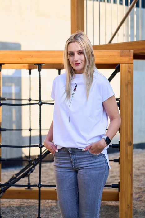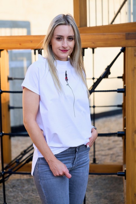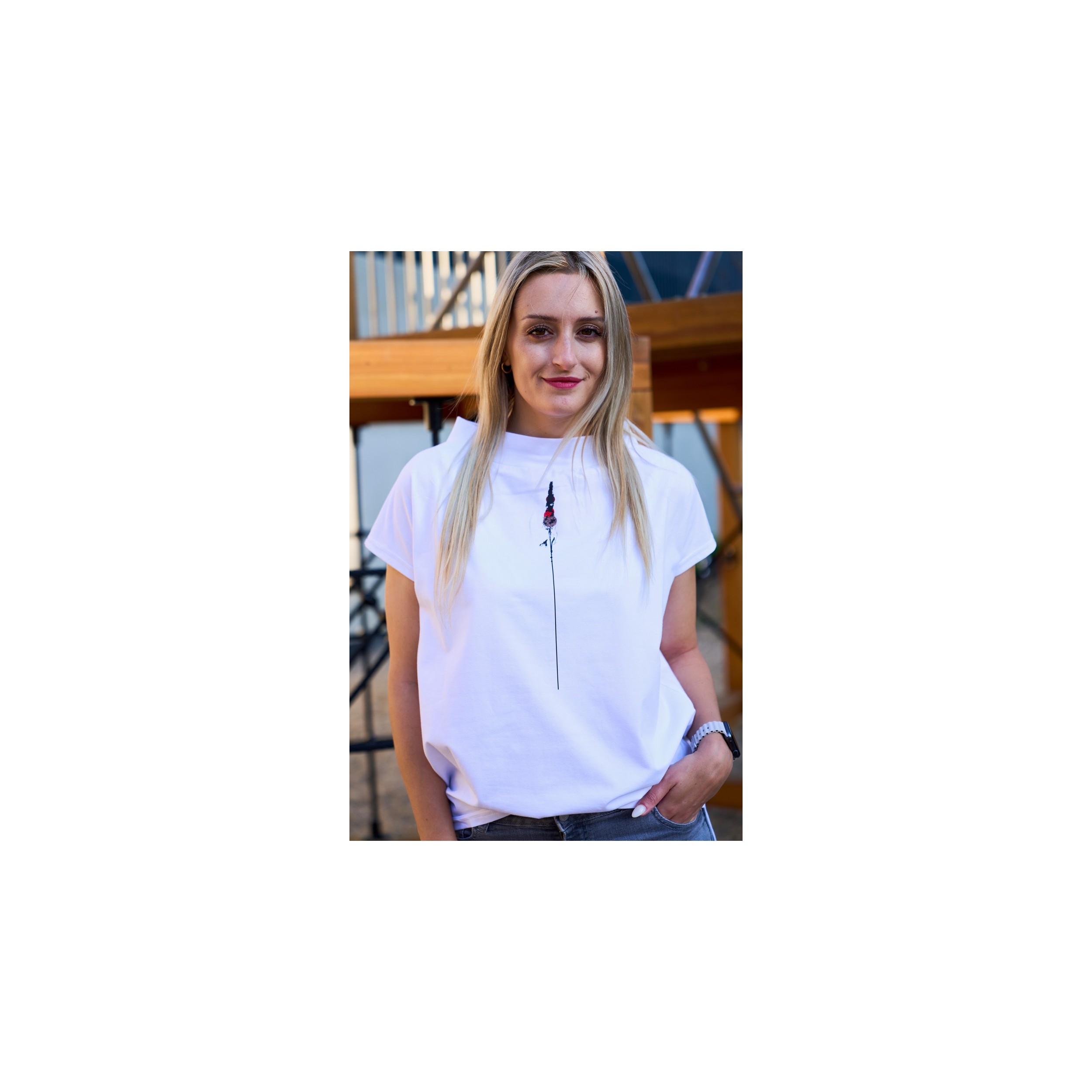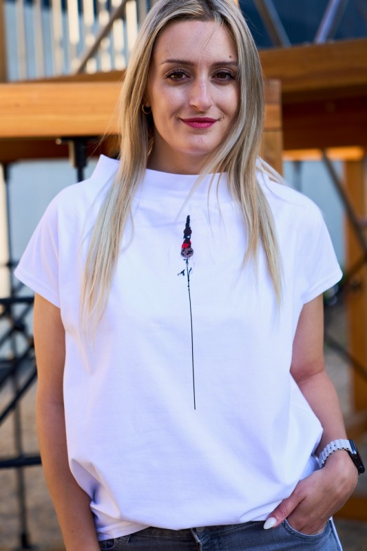 Bílá volnější triko z jemné bavlny se stojáčkem. Přední díl je kratší a vypadá dobře ho zahnout do šortek/kalhot. Autorský tisk.