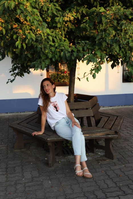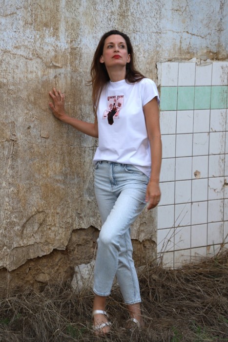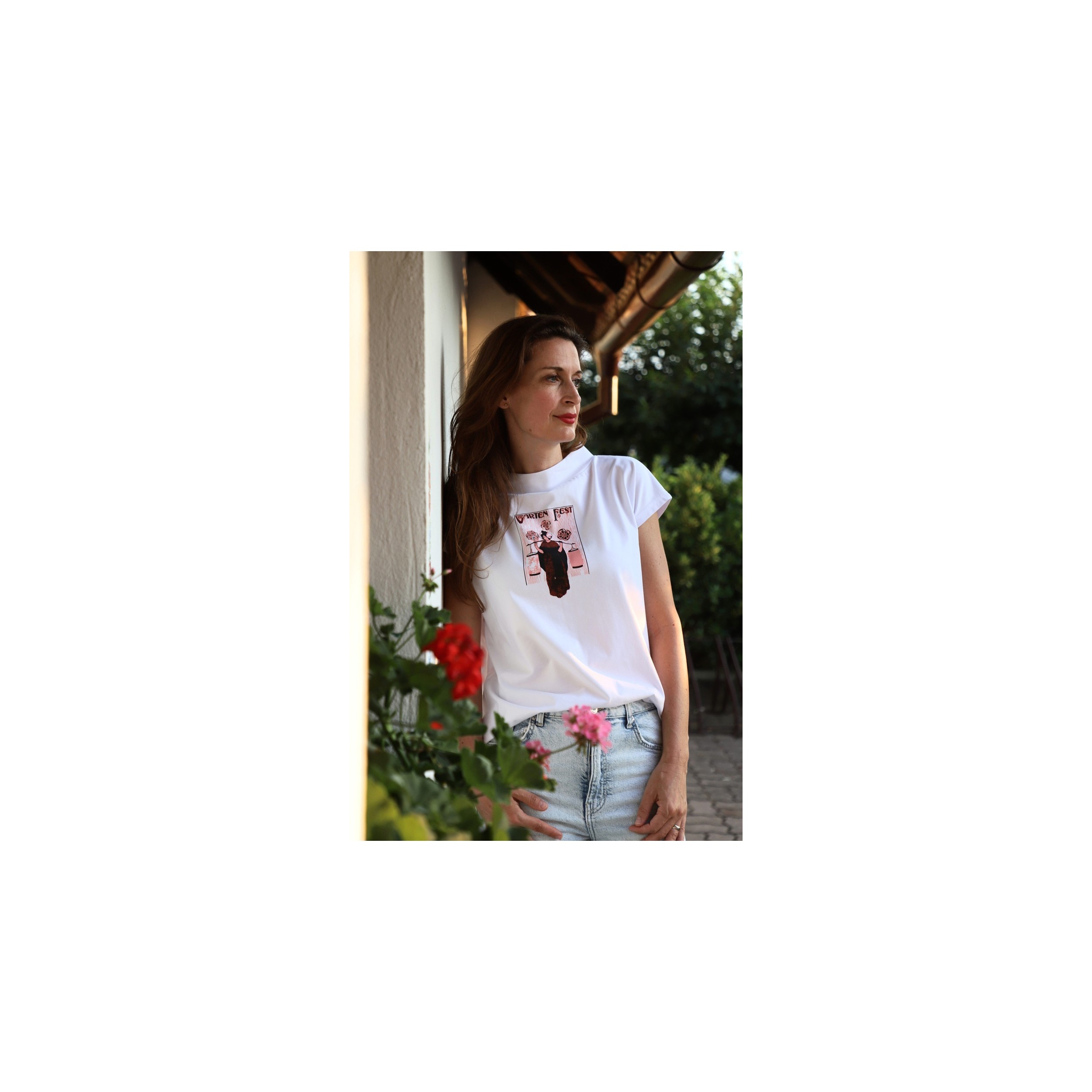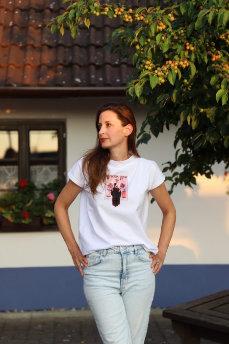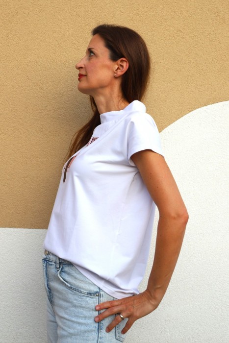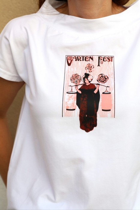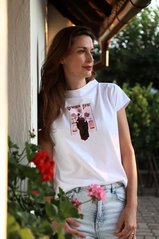 Bílá volnější triko z jemné bavlny se stojáčkem. Přední díl je o něco kratší a vypadá dobře ho zahnout do šortek/kalhot. Tisk na secesní téma (Garten fest...německy Zahradní slavnost)