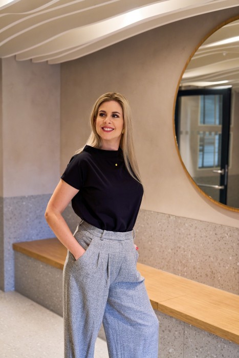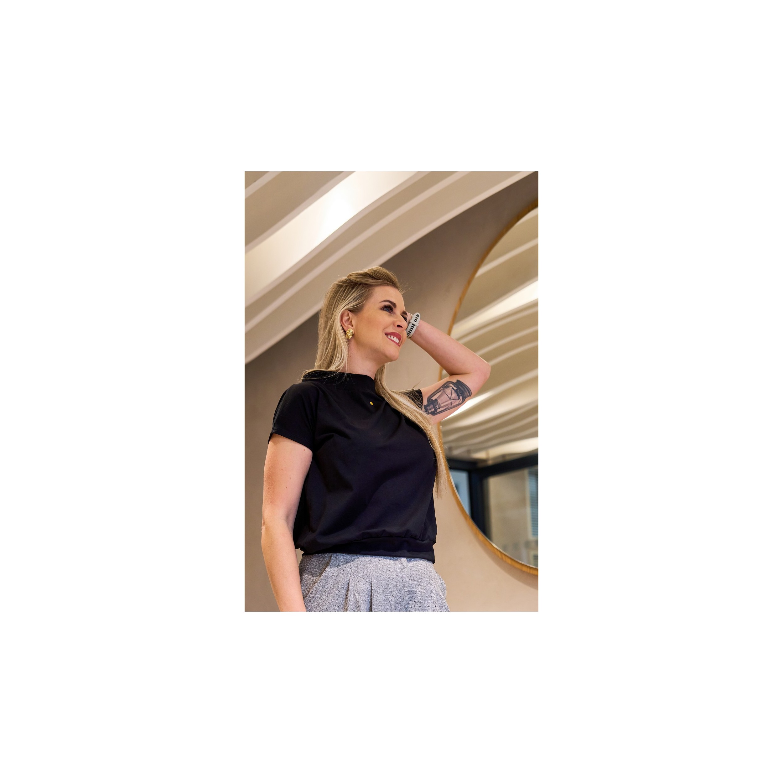 Černé volnější triko z jemné bavlny v pohodlném střihu a slušivým  stojáčkem. Na přední straně je tisk malého zlatého puntíku. Triko má spodní zakončení do pružného lemu. Skvělý kousek pro každodenní nošení s trochou osobitého designu.