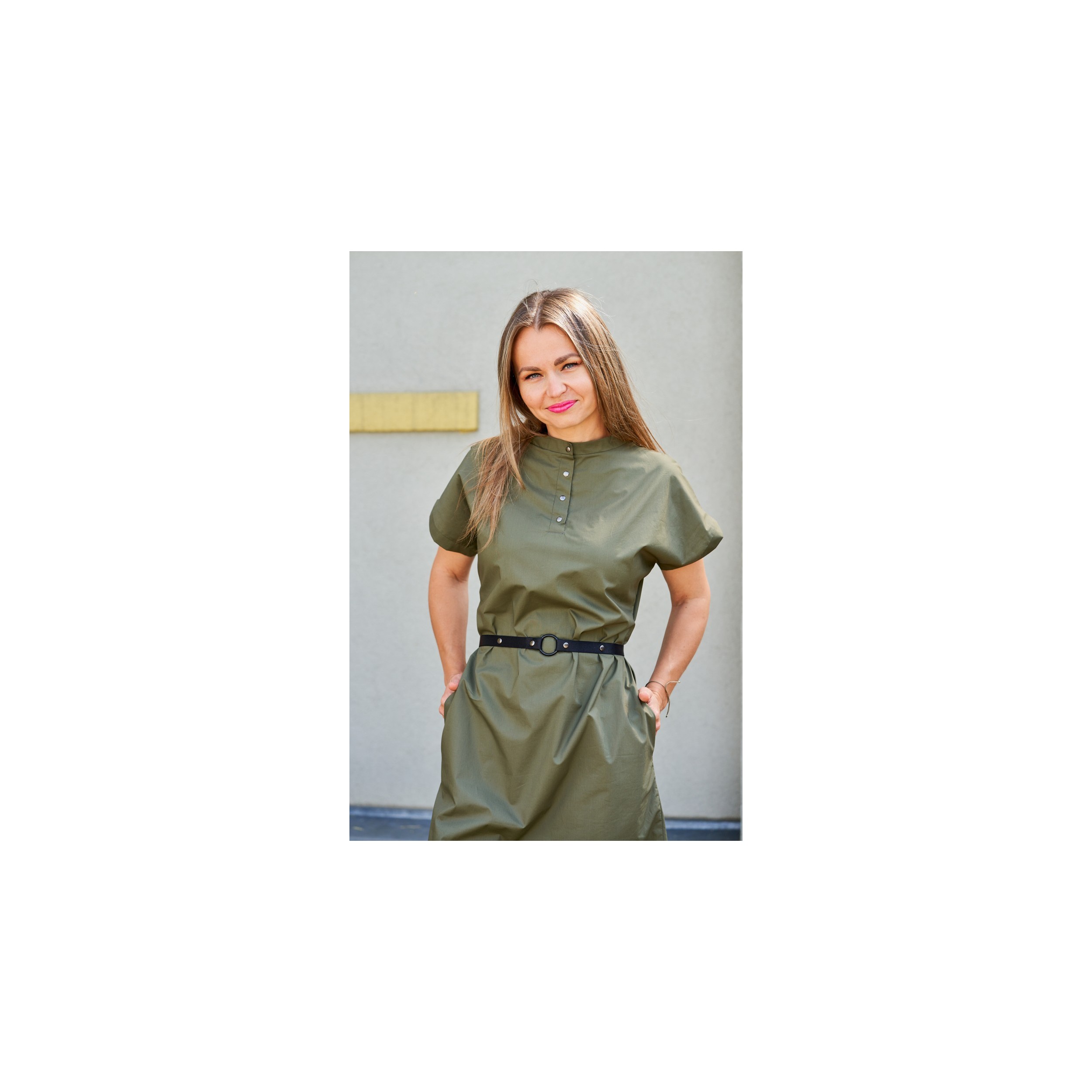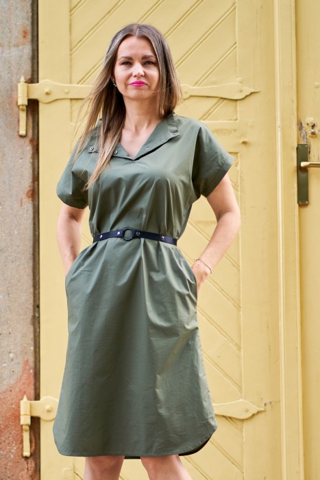 Šaty z bavlněného popelínu khaki barvy. Mají kapsy, pásek je součástí.