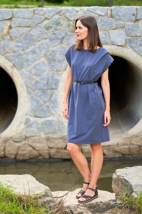 Tmavě šedé bavlněné šaty. Mají sklady na ramenou, kapsy. Součástí je černý pružný pásek.
