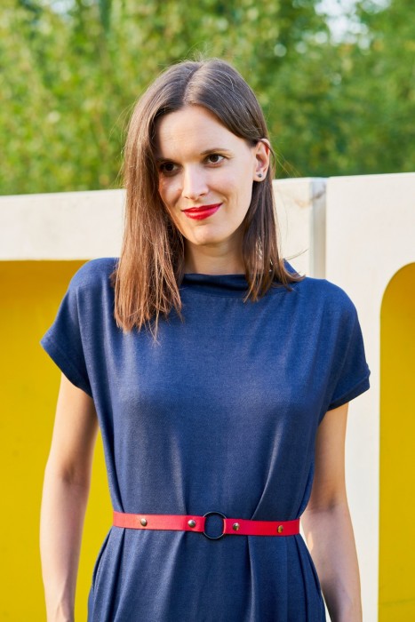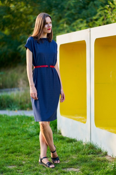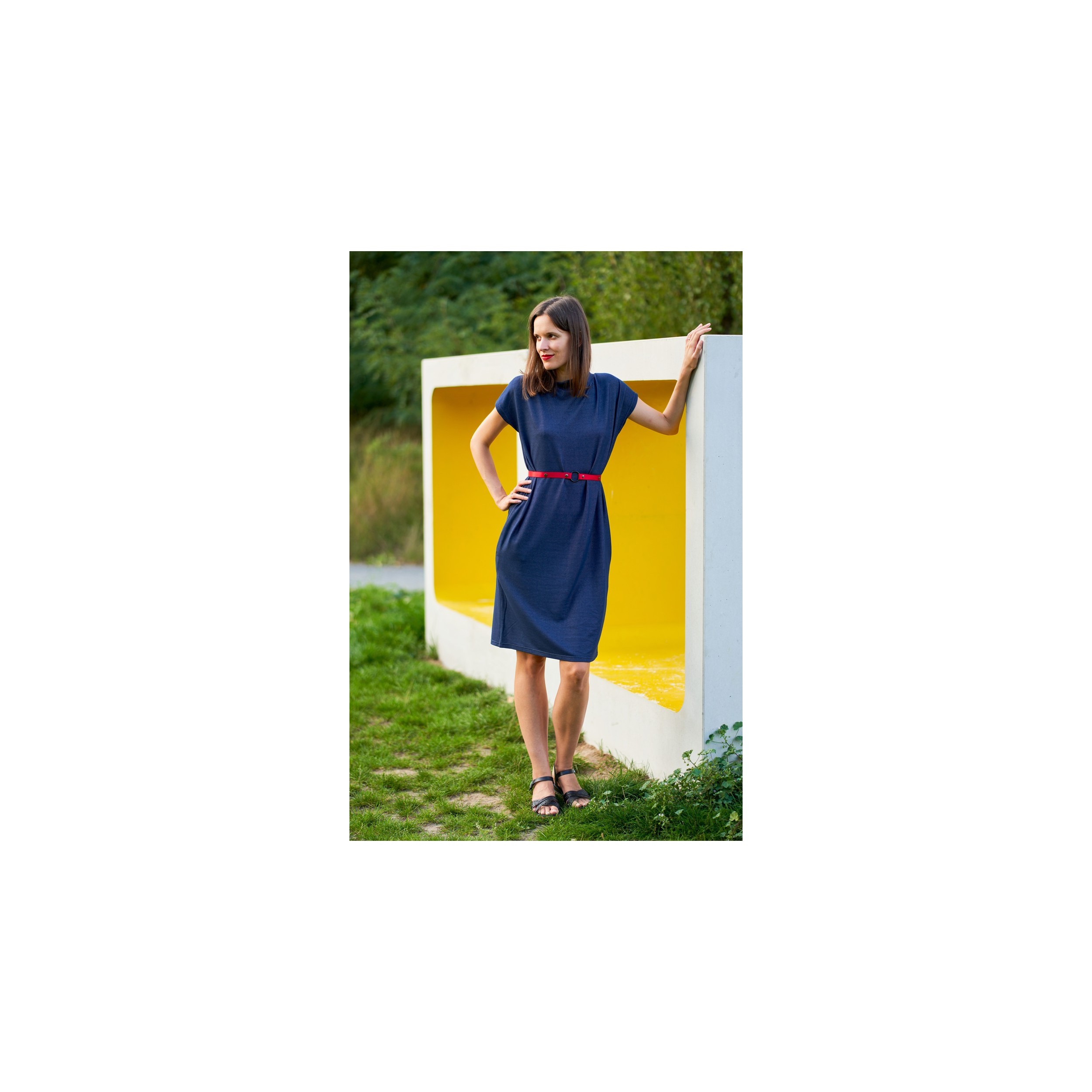 Viskózové splývavé modré  šaty, vzor na látce imituje jeans. Mají kapsy. Součástí je červený gumičkový pásek, ale můžete si místo něj vybrat jiný z nabídky. (napište do poznámek)