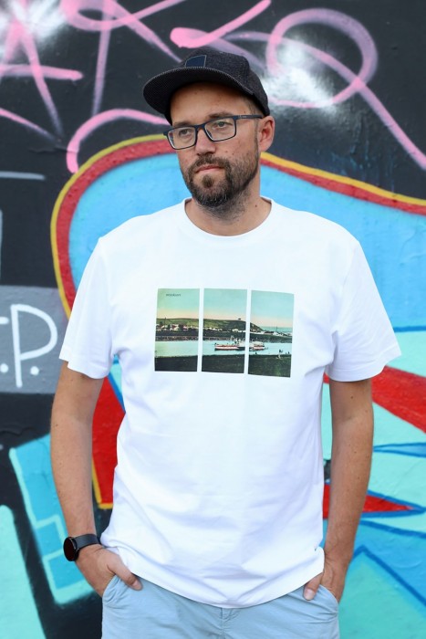 Bílé bavlněné pánské triko  vyšší gramáže s digitálním potiskem dobové pohlednice pražských Modřan.