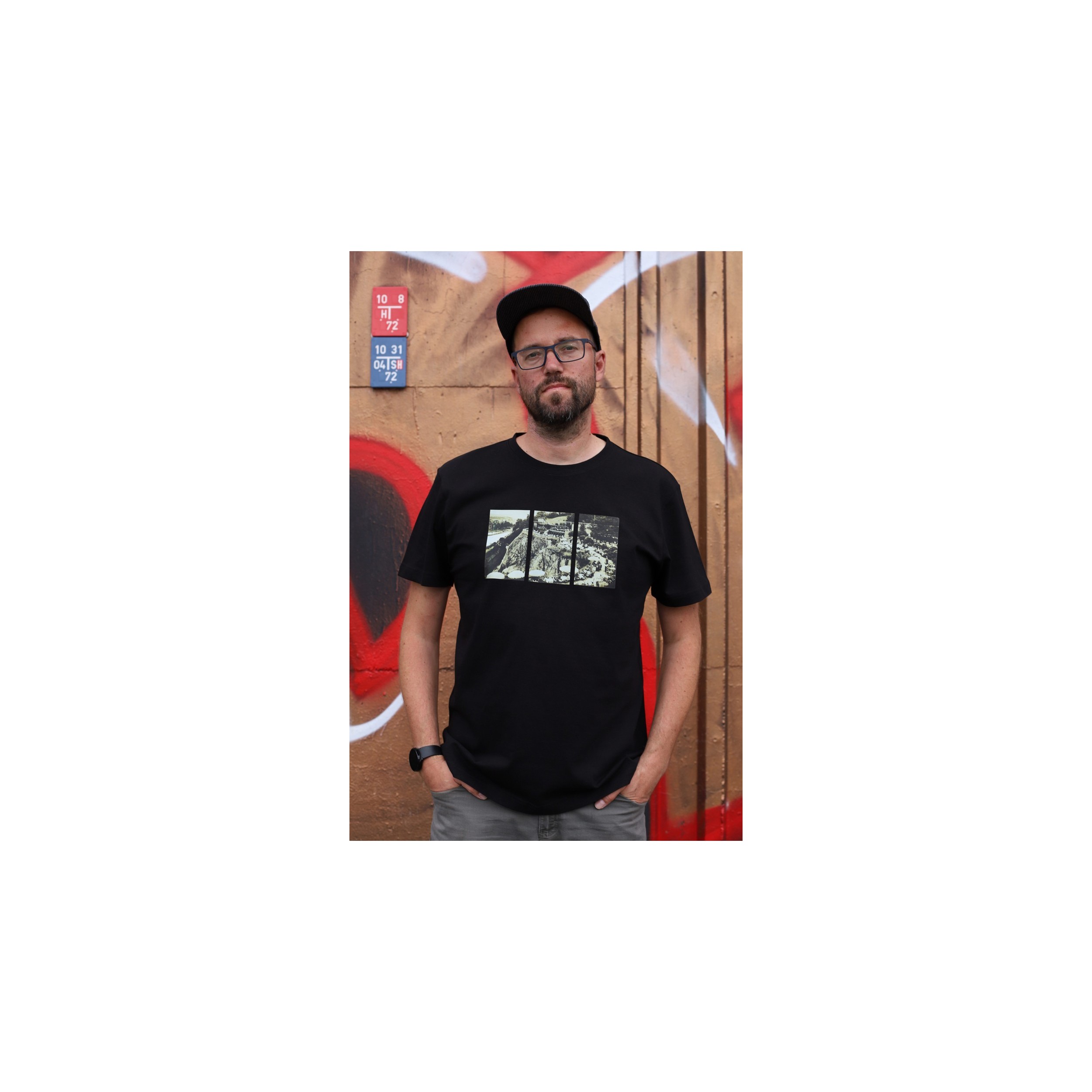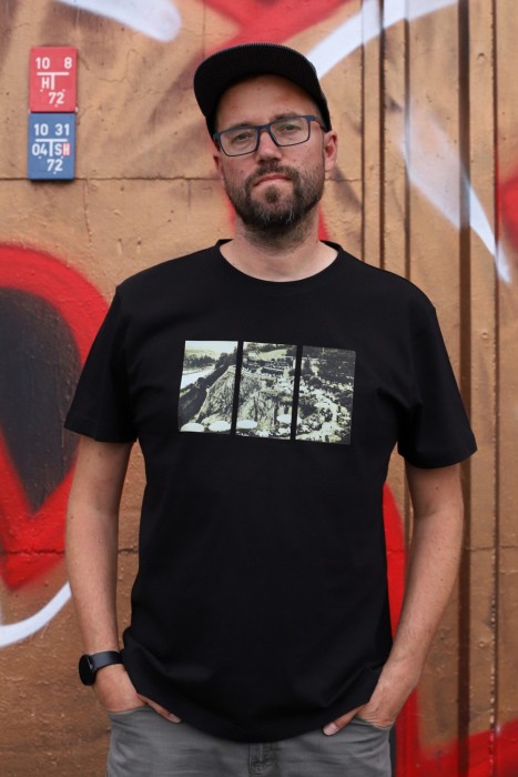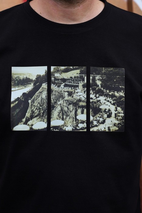 Bílé bavlněné pánské triko vyšší gramáže s digitálním potiskem dobové pohlednice Barrandovských teras.