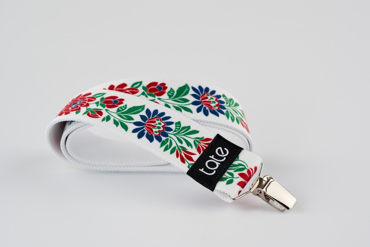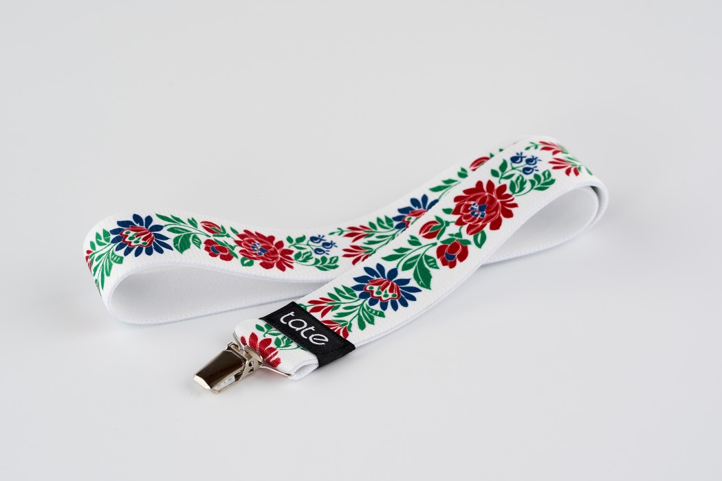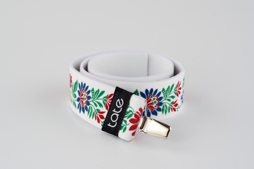Pružný pásek s folklórním vzorem a šlovým klipem.