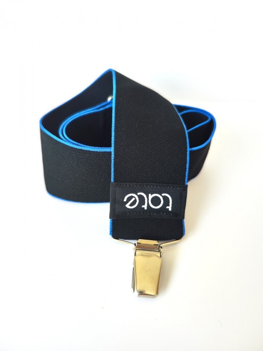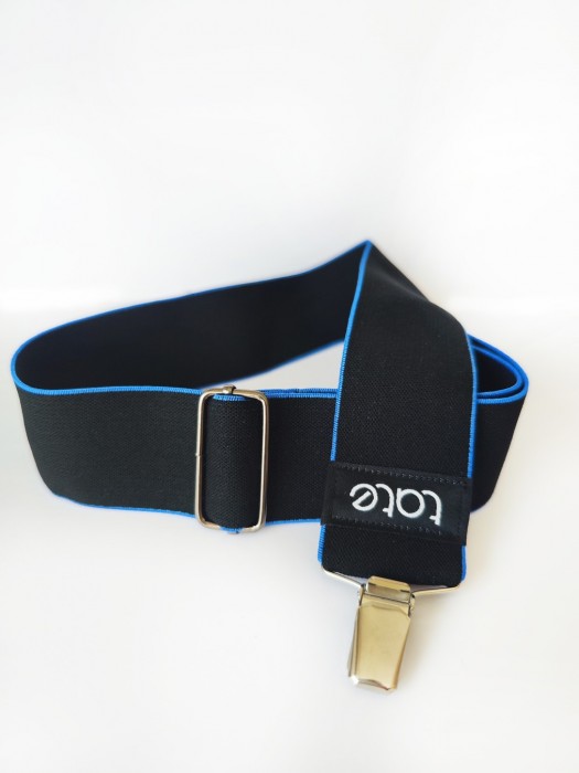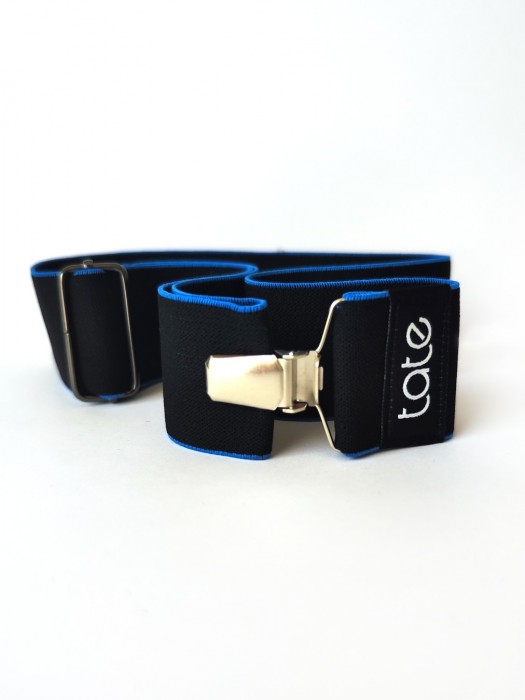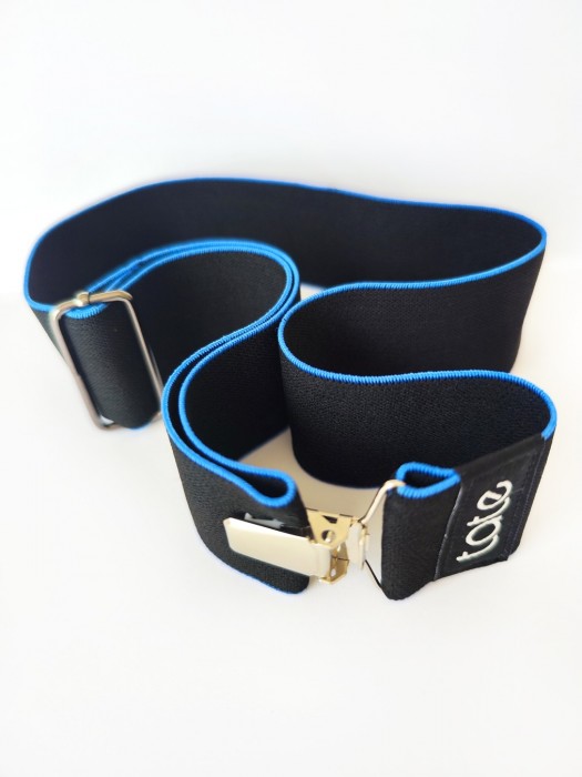 Černý posunovací pružný pásek s modrým lemem a šlovým klipem.