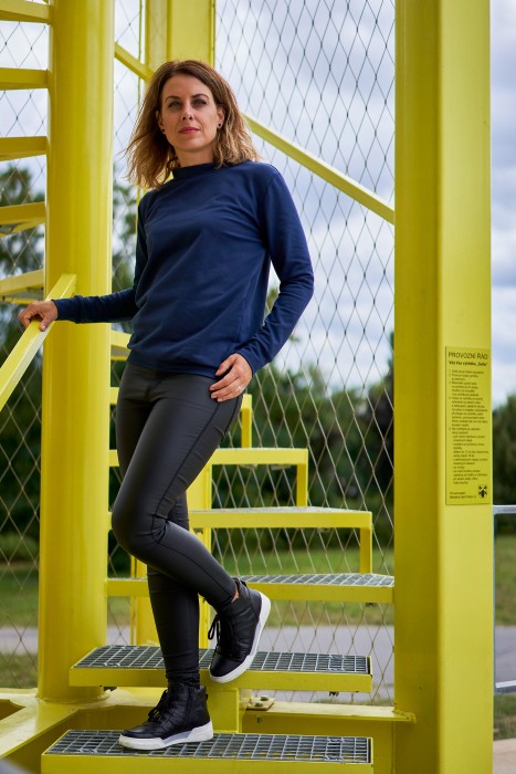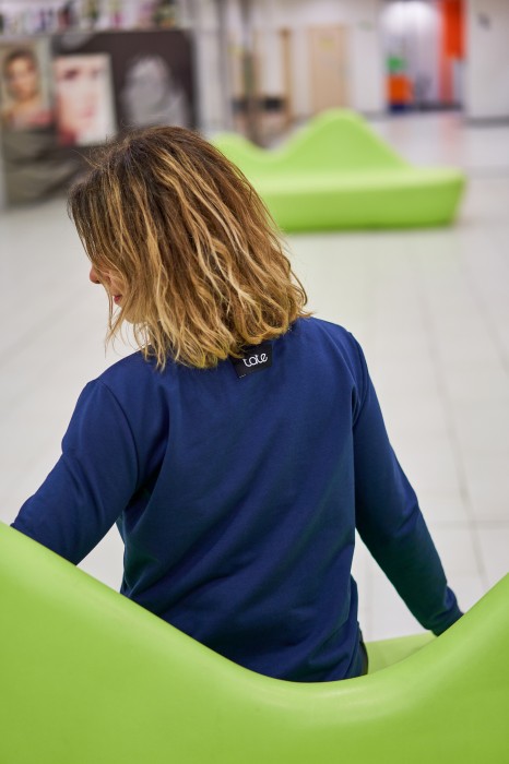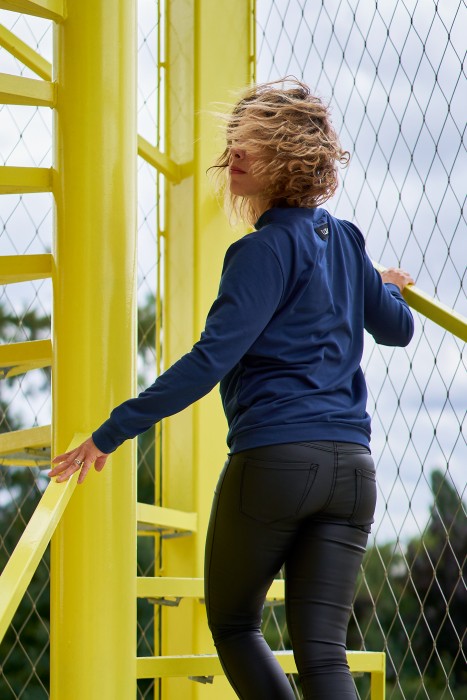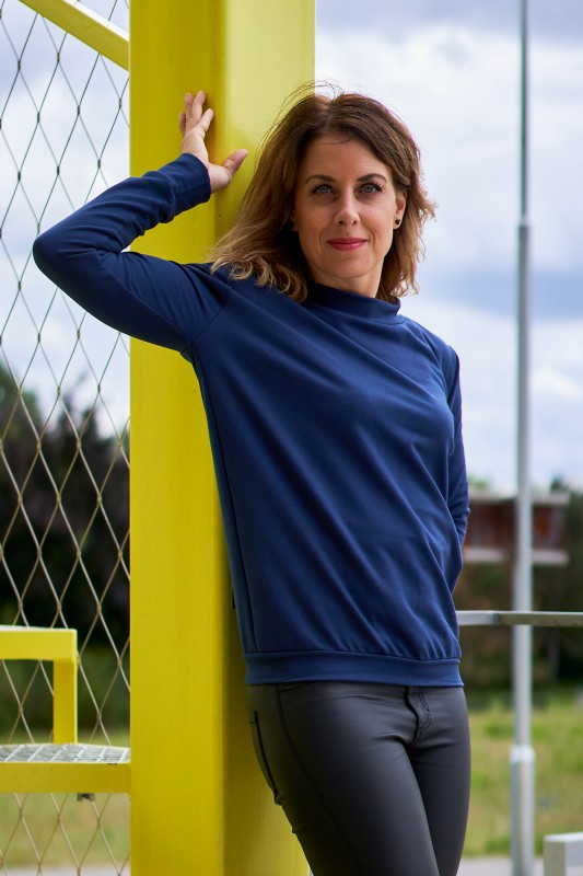 Tmavě modrá tenčí mikina  se stojáčkem. Materiál: Bavlněná pružná teplákovina