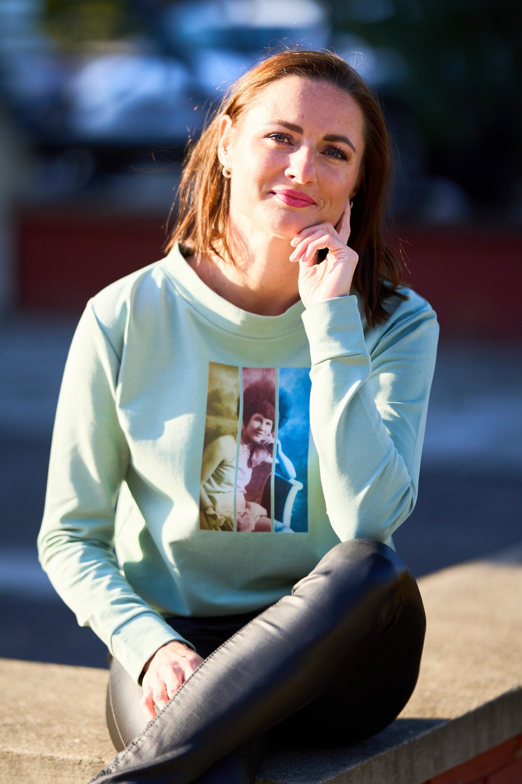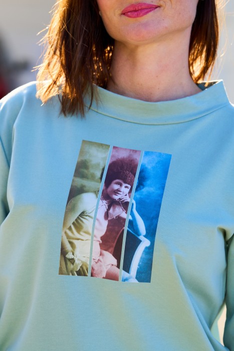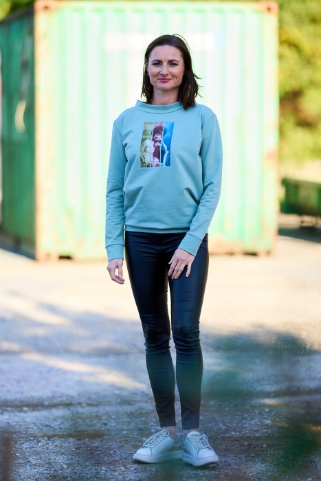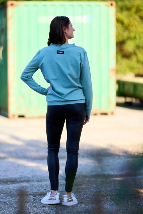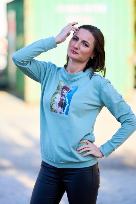 Tenčí zelenkavá mikina. Autorský potisk. Materiál: Bavlněná pružná teplákovina