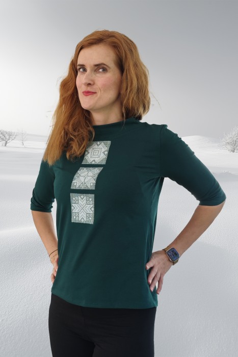 Elegantní dámské triko s tříčtvrtečními rukávy a širším stojáčkem vyniká minimalistickým, ale propracovaným designem.